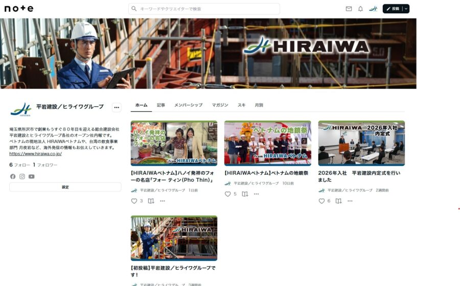 平岩建設とヒライワグループ各社の情報を伝えるオープン社内報として「note」を始めました。