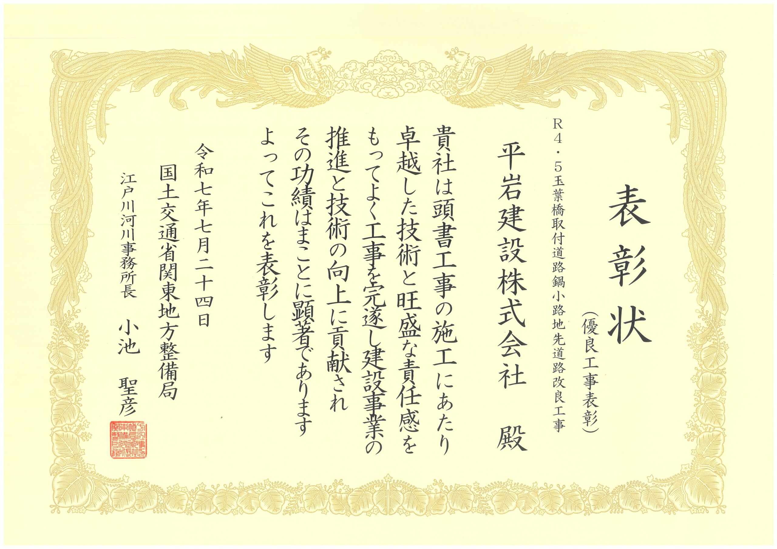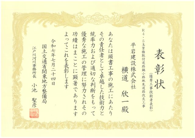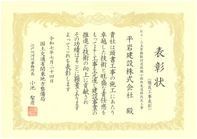 令和7年7月24日、国土交通省関東地方整備局より、令和6年度に完成した「R4・5玉葉橋取付道路鍋小路地先道路改良工事」の施工に対して「優良工事」及び「優秀工事技術者」の表彰を受けました。