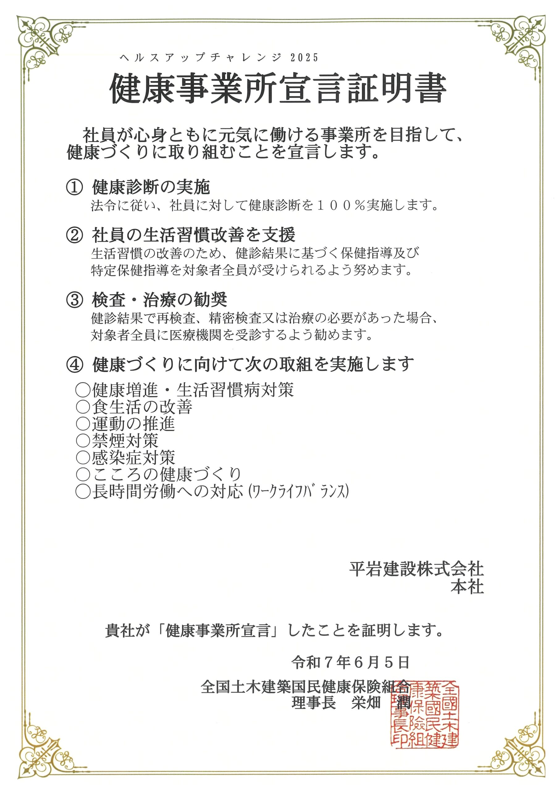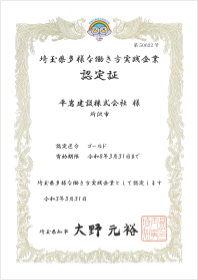 多様な働き方実践企業認定制度(埼玉県)に登録(ゴールド認定)しております。その一環として建設現場4週8閉所を目標に、生産性の向上・業務改善に取り組んでおります。