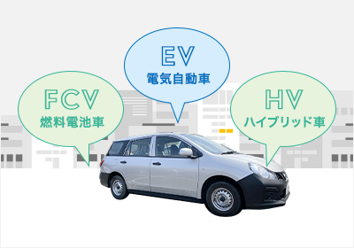 ガソリン車から次世代燃料車への移行に向け、持続的にガソリン車からエコカーへ、エコカーから次世代燃料へと移行する事を目標として、CO₂削減に取り組んでおります。