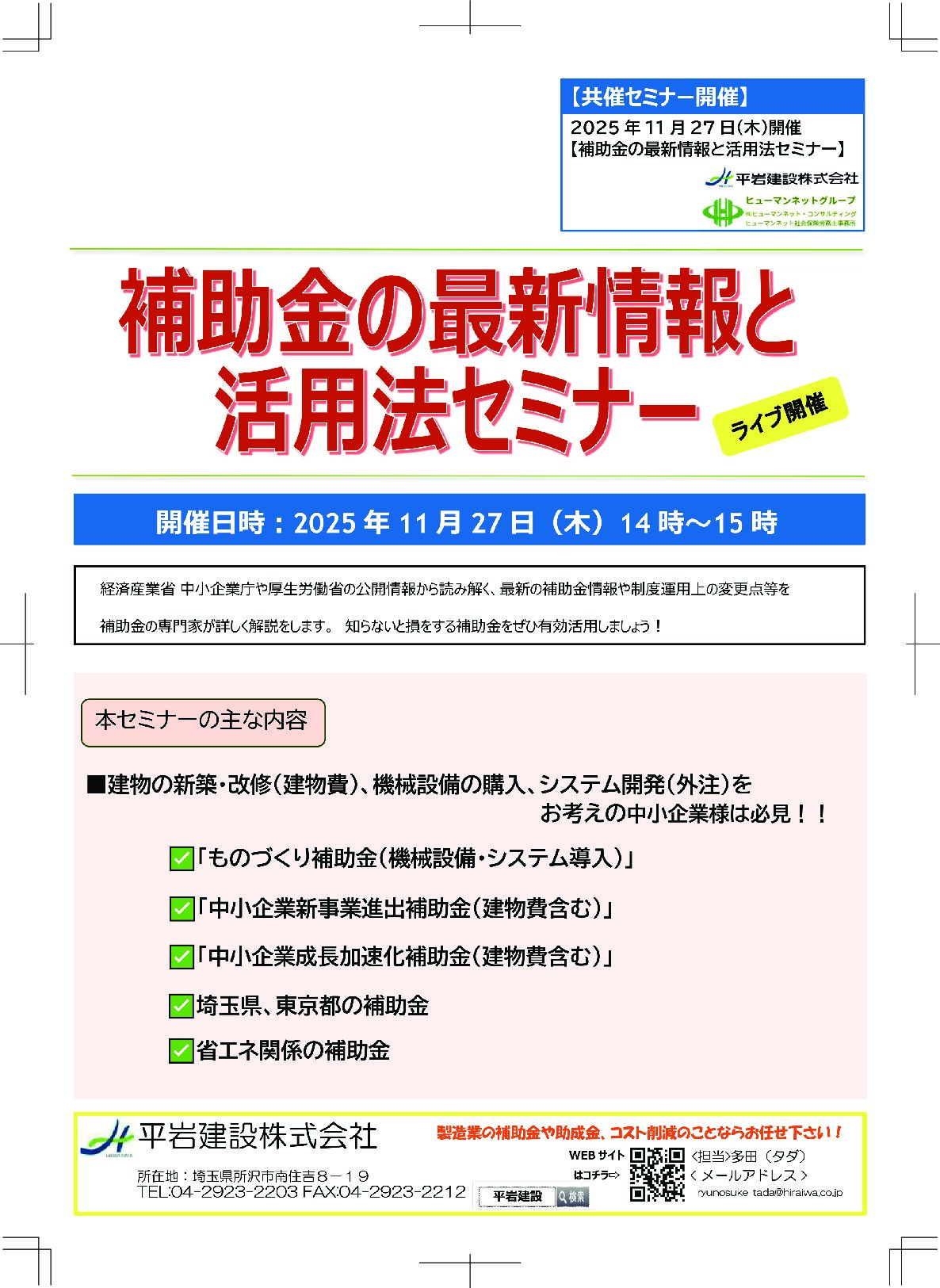 - 【補助金の最新情報と活用法セミナー】開催のお知らせ 補助金の専門家をお招きし、最新の補助金情報や制度運用上の変更点等を詳しく解説いたします。 補助金を活用して、建物の新築や改修、機械設備の購入等、検討してみませんか? 参 […]